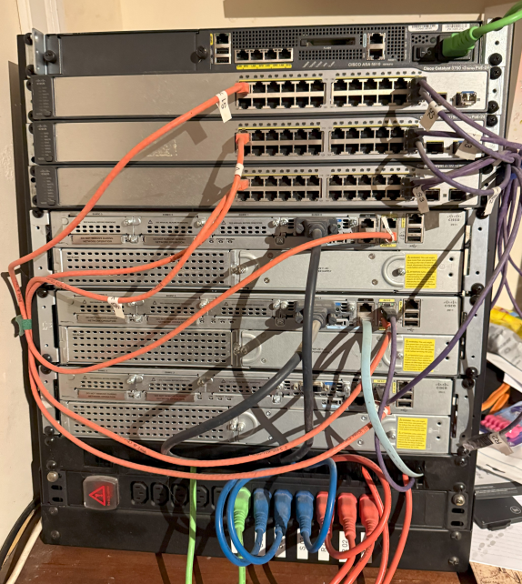After earning my CCNA and thoroughly enjoying the hands-on experience with lab equipment, I expanded my collection by adding more switches and routers. I’m now preparing for the Cisco Certified Network Professional (CCNP) certification, and here’s a look at my current lab setup: